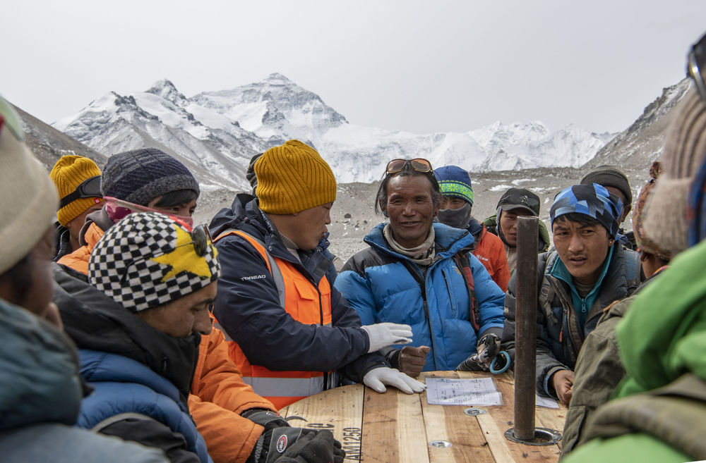 格桑(中間穿藍(lán)色羽絨服者)和其他村民一起商議將光纖運(yùn)送到海拔6500米前進(jìn)營地的方法(2020年4月15日攝)。2020珠峰高程測(cè)量期間,為保障峰頂信號(hào)質(zhì)量,網(wǎng)絡(luò)運(yùn)營商需要將光纖鋪設(shè)至海拔6500米的珠峰前進(jìn)營地。格桑和其他村民一起,承擔(dān)起運(yùn)輸光纖的任務(wù)。