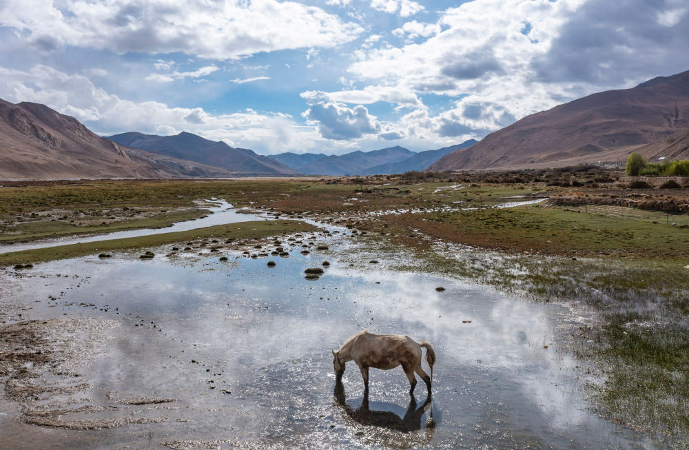 天氣轉(zhuǎn)暖,珠峰腳下顯露出一抹綠色。流經(jīng)扎西宗鄉(xiāng)的扎嘎曲河,綠樹吐出新芽,馬兒在濕地里悠閑吃草。