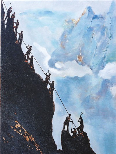 走近一幅畫(huà)作細(xì)看,寬近1米,高足1米有余,畫(huà)面是雪山,蛋殼、漆料等多種原料在畫(huà)布上有序排列,貢獻(xiàn)各自的色彩,繪就了一幅高原特有的日照金山景色。據(jù)何肅先介紹,這是這期新參加培訓(xùn)班的畫(huà)師創(chuàng)作的。
