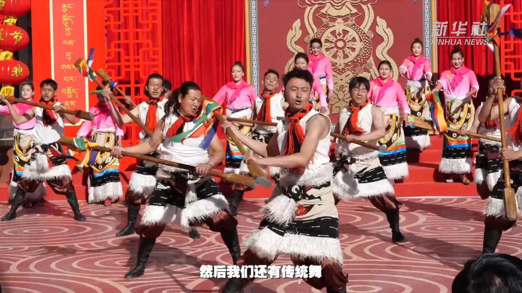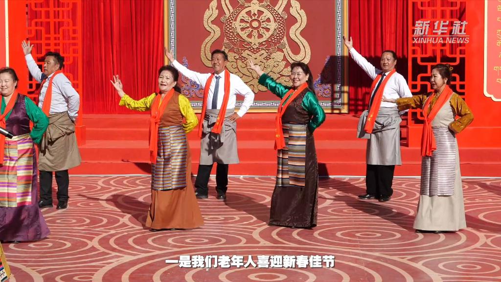 農(nóng)歷癸卯兔年春節(jié)大年初一,西藏拉薩市娘熱街道吉蘇4組的村民們身著節(jié)日盛裝,在家門口觀看娘熱民間藝術(shù)團演繹的2023年西藏“啟航新征程 幸福中國年”村晚。