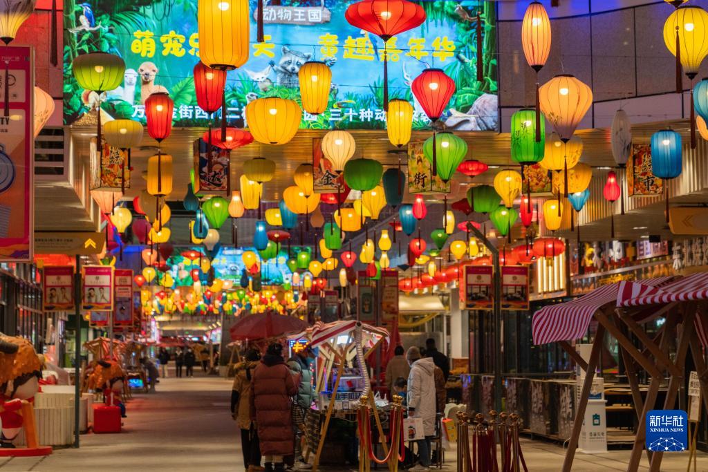新年到來,拉薩城關(guān)萬達廣場商圈的樓宇外墻貼上了迎接2023年的喜聯(lián),掛上了燈籠等裝飾品,喜慶氛圍濃厚。