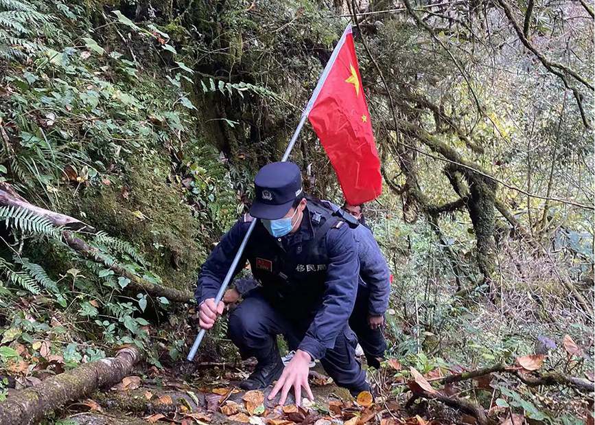 圖為拉郊邊境派出所移民管理警察王彥凱駐點期間,帶領護邊員開展邊境巡邏踏查。諾布旺堆攝