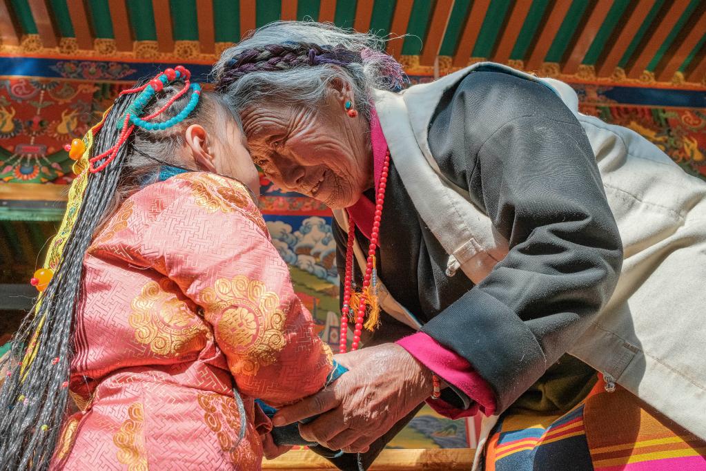 今年,西藏農(nóng)家年和春節(jié)“巧遇”同一天,習(xí)俗雖不同,但年味皆濃。從縣城買來的年貨,一家人制作的切瑪和卡塞(油炸面食)等傳統(tǒng)供品和食品,紛紛擺上了桌。第四代的孩子們,也換上了嶄新的藏裝,頭戴綠松石點綴的頭飾,依偎在祖奶奶次旦的身旁。