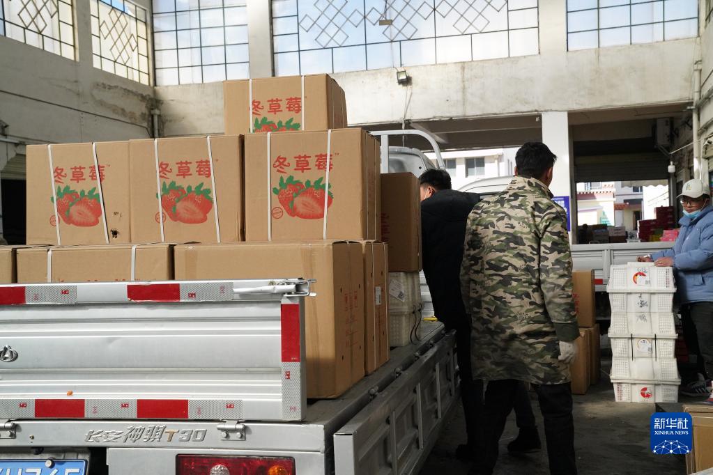 東嘎批發(fā)市場(chǎng)里,員工們正將水果搬上車(chē)廂(1月28日攝)。新華社記者黃耀漫 攝