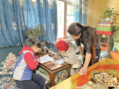圖為三有村村民德吉正在輔導孩子做作業(yè)。拉薩融媒記者 莫瑞英攝