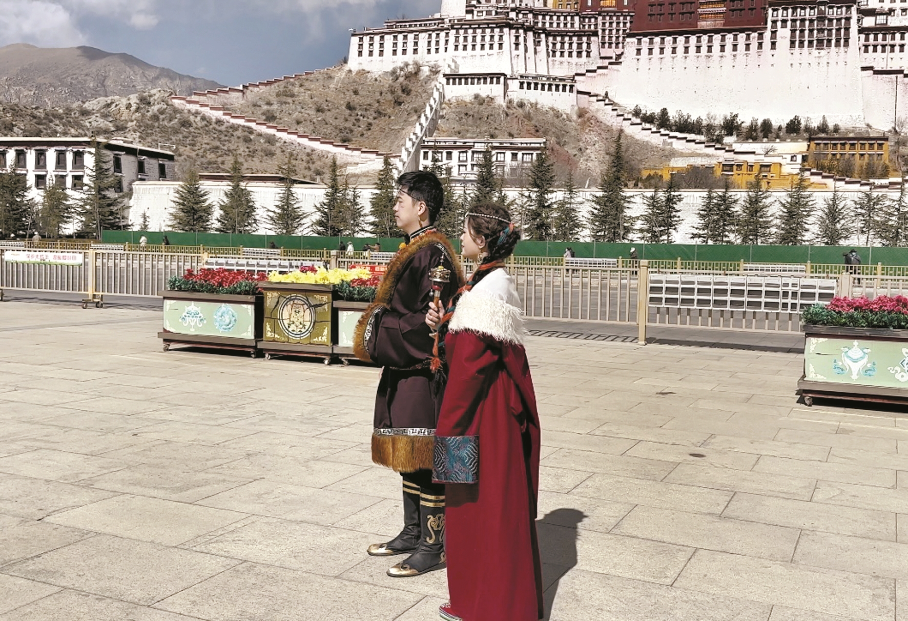 圖為游客穿著民族服裝在布達拉宮廣場拍照留念。 拉薩融媒記者 次仁卓嘎攝