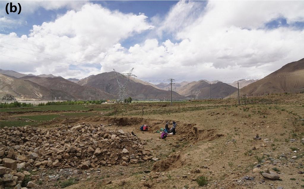 圖(b)為科考隊(duì)員發(fā)現(xiàn)共塘遺址后隨即進(jìn)行地層剖面清理和樣品采集。(資料圖片由第二次青藏科考隊(duì)“人類(lèi)活動(dòng)歷史及其影響”分隊(duì)提供)