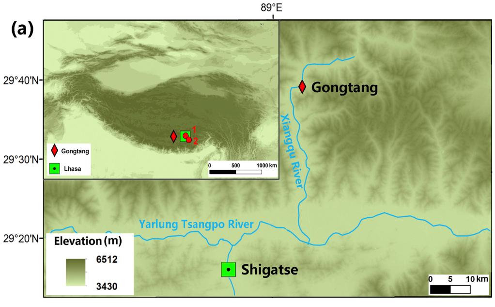圖(a)為雅魯藏布江中游部分地區(qū)遺址背景資料圖,曲貢(1)、邦嘎(2)和共塘遺址位置(紅色菱形所示)。(資料圖片由第二次青藏科考隊(duì)“人類(lèi)活動(dòng)歷史及其影響”分隊(duì)提供)