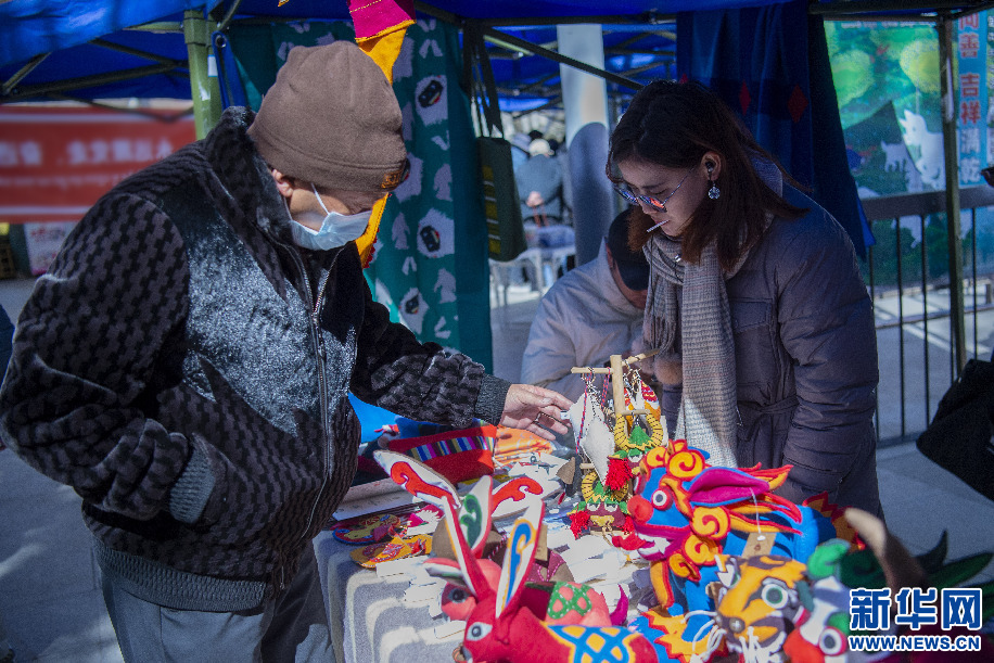 2月14日,群眾在直孔朗霞傳統(tǒng)針織加工專業(yè)合作社展位上挑選由傳統(tǒng)針織技藝制作的年貨。新華網 旦增努布 攝