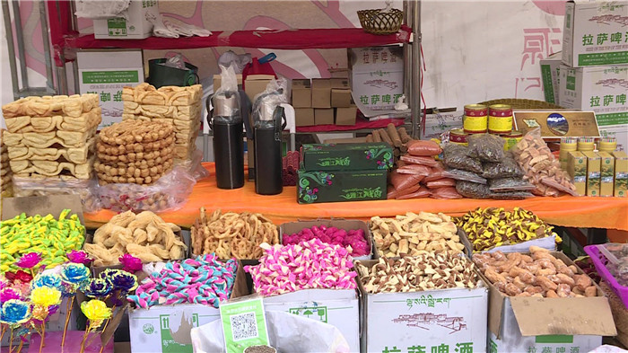 與往年一樣,酥油、卡賽、人參果等傳統(tǒng)食品和五彩青稞穗等仍是主角,來自新疆的果干、當?shù)氐男迈r水果也同樣備受群眾喜愛。