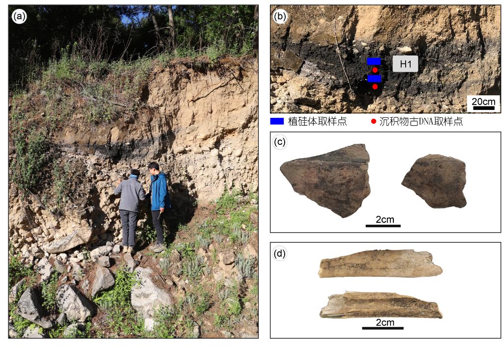 圖(a)孔桑橋遺址調(diào)查剖面圖;圖(b)采樣位置;圖(c)調(diào)查剖面出土陶片;圖(d)調(diào)查剖面出土動物骨骼。(資料圖片由聯(lián)合科考隊(duì)提供)