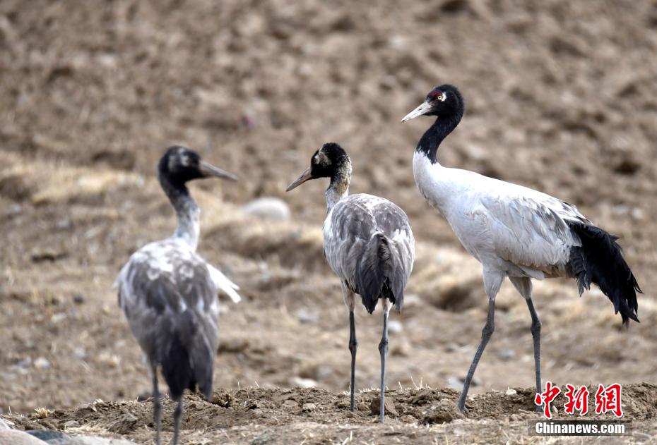 2月19日,黑頸鶴與幼鶴在田間覓食。