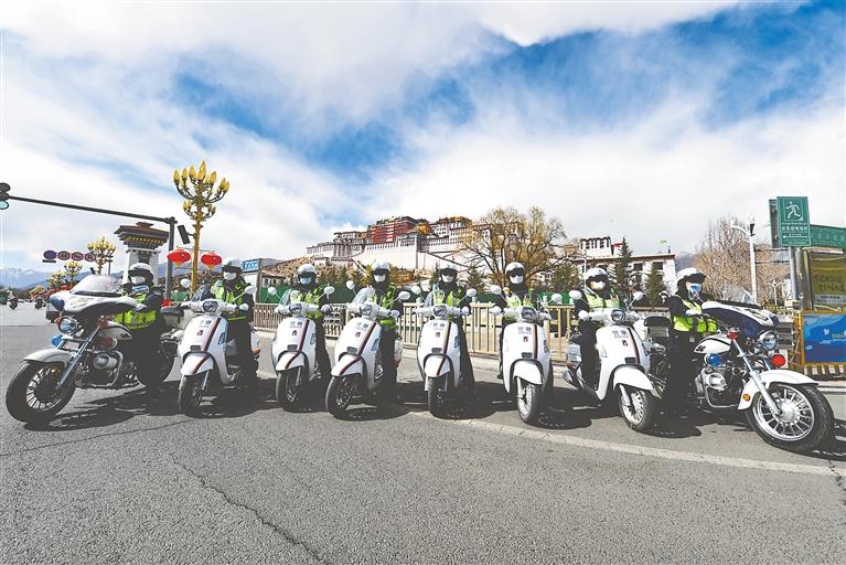 拉薩市公安局交警支隊(duì)城北大隊(duì)女子中隊(duì)交警颯爽英姿。唐斌 攝