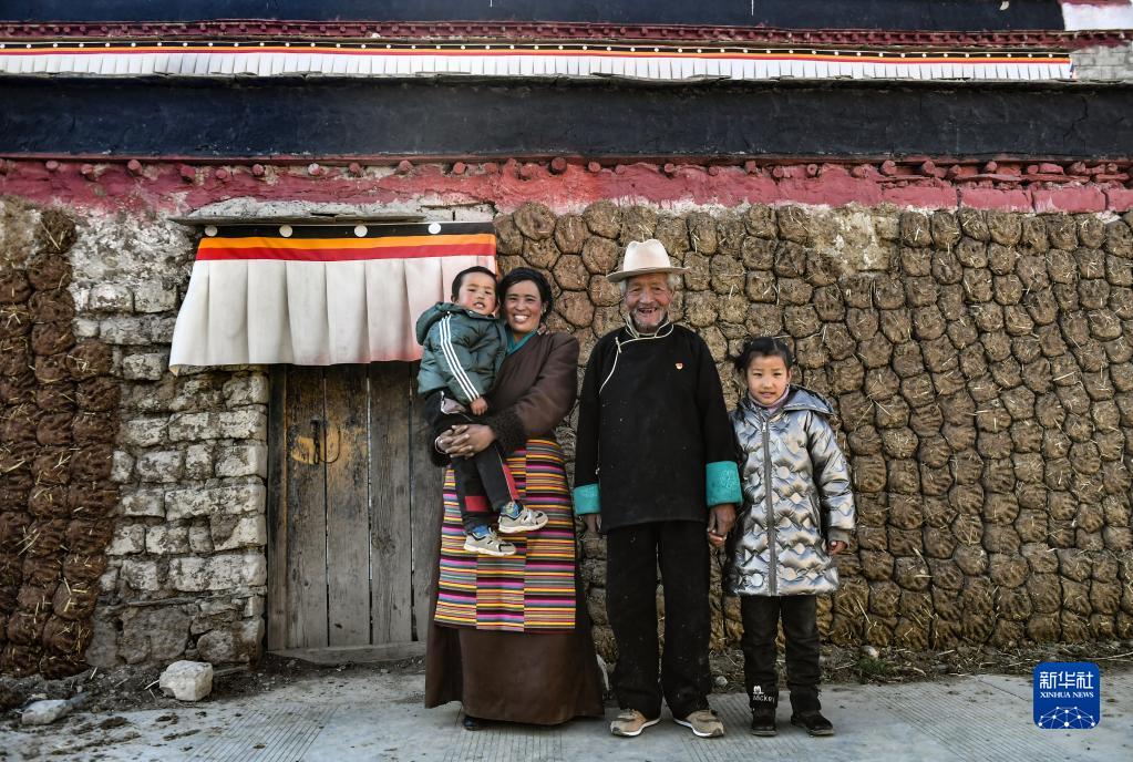 達(dá)國(guó)杰(右二)和家人在家門前合影(2021年3月22日攝)。新華社記者 孫瑞博 攝