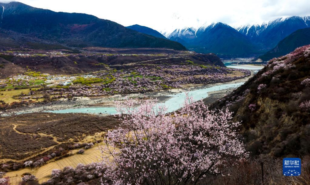 這是西藏林芝市米林縣索松村雅魯藏布大峽谷入口處的桃花景觀(2023年3月26日攝)。新華社記者 姜帆 攝