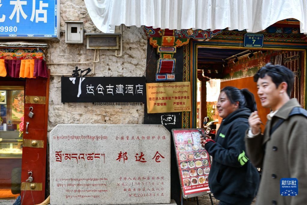 西藏拉薩市民走過(guò)八廓街老城區(qū)邦達(dá)倉(cāng)古建酒店(2023年3月24日攝)。新華社記者 晉美多吉 攝