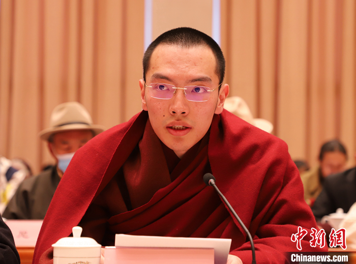 圖為宗教界代表達隆夏仲·阿旺洛?!さ┰銮岈斣谧剷习l(fā)言。 中新社記者 趙延 攝