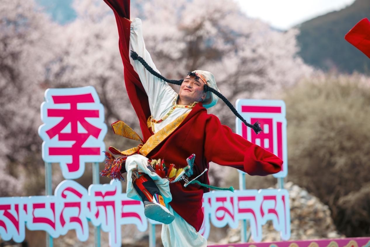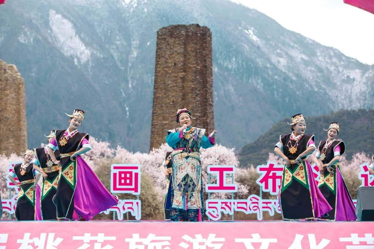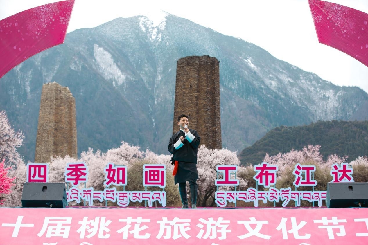皚皚雪山下,千年古堡旁,灼灼桃花,花開正艷。羅布桑珠、巴金旺甲、齊旦布、桑杰才讓等藏族知名歌手、工布江達本地歌手、當?shù)厝罕婟R聚,流行歌曲與工布民歌等當?shù)靥厣硌萁Y(jié)合,為網(wǎng)友們獻上了一場桃花樹下的歌舞盛宴。