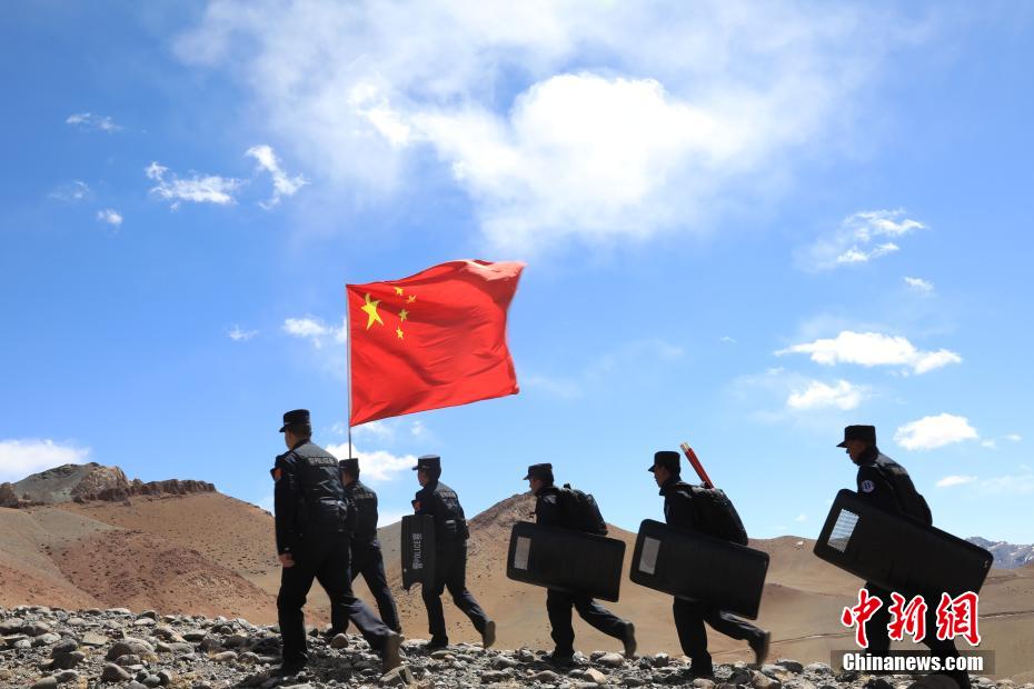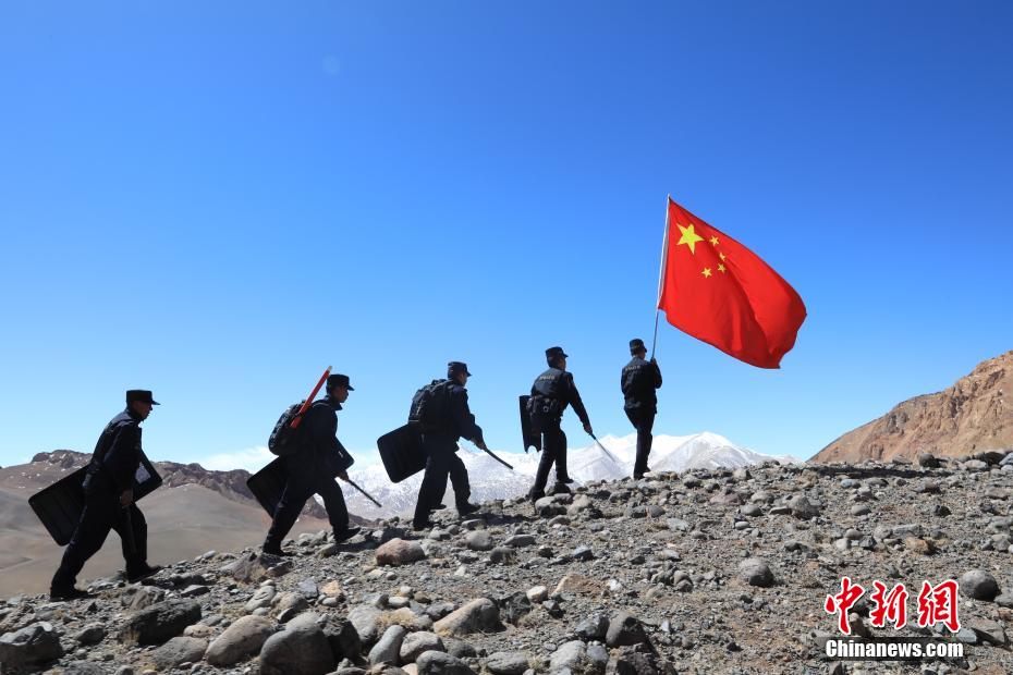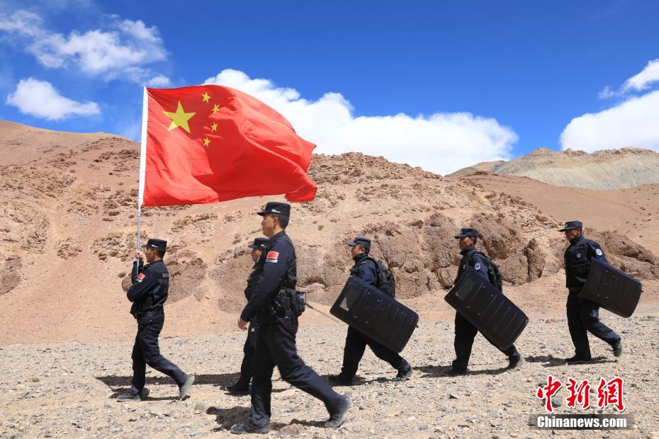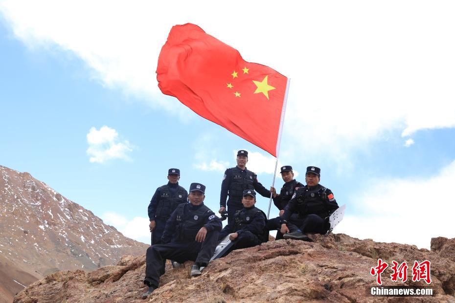 近日,西藏阿里邊境管理支隊扎西崗邊境派出所組織民警和護邊員通過乘車巡邏和徒步巡邏相結(jié)合的方式,前往海拔4800米的“守邊固邊第一村”——典角村古格川執(zhí)勤點巡邏,經(jīng)過一個小時的車巡和一個小時的徒步巡邏,民警到達了古格川執(zhí)勤點。通過巡邏,及時掌握了邊境一線情況,確保了邊境轄區(qū)安全穩(wěn)定。圖為民警與國旗合影。郭遠敬 攝