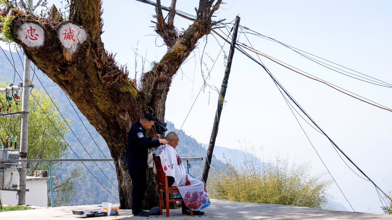 西藏日喀則邊境管理支隊(duì)立新邊境派出所民警正在為轄區(qū)老人理發(fā)。人民網(wǎng)記者 唐宋攝