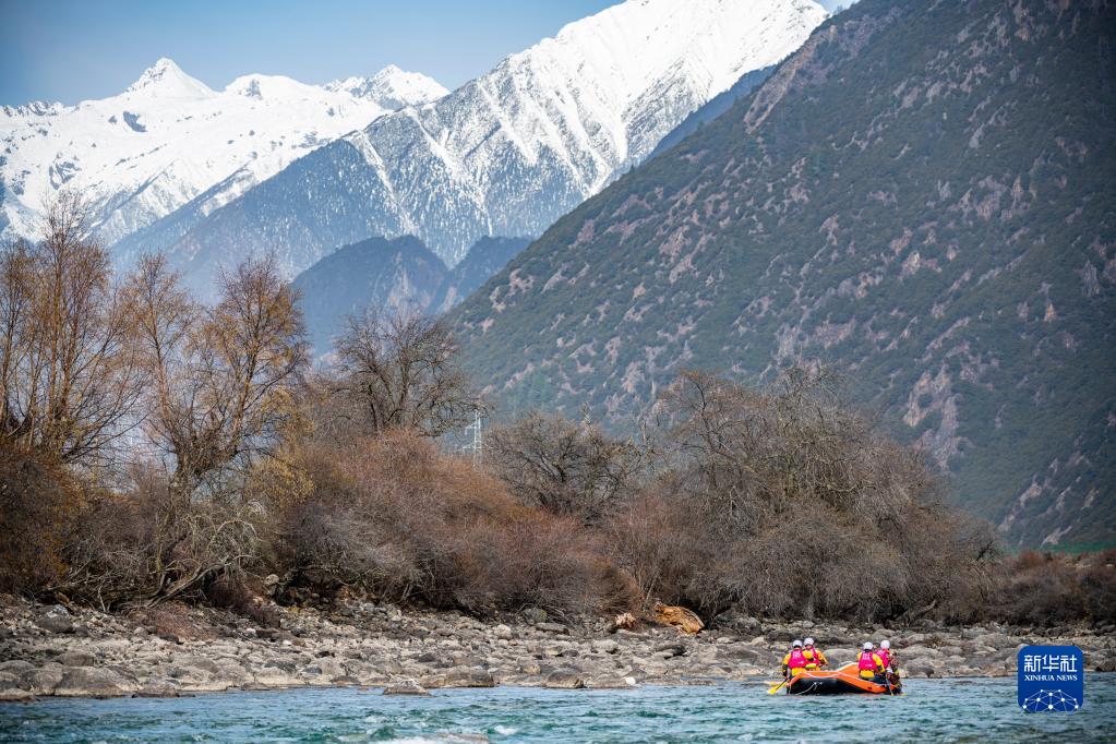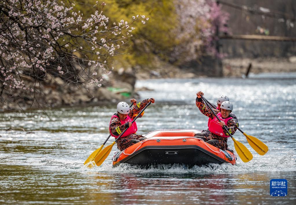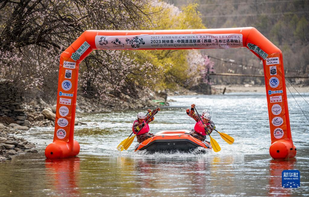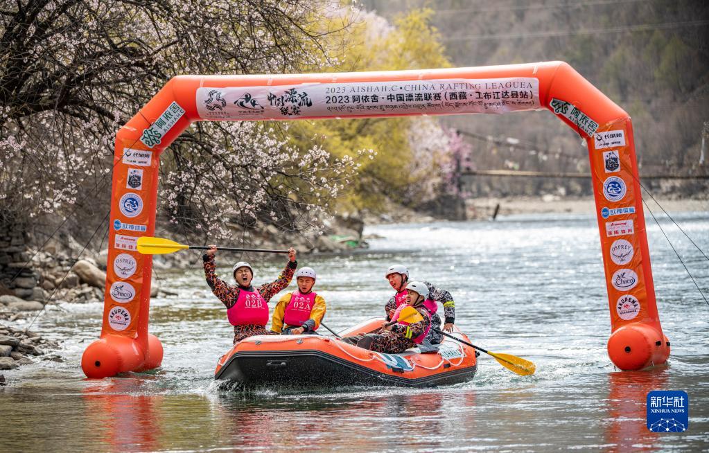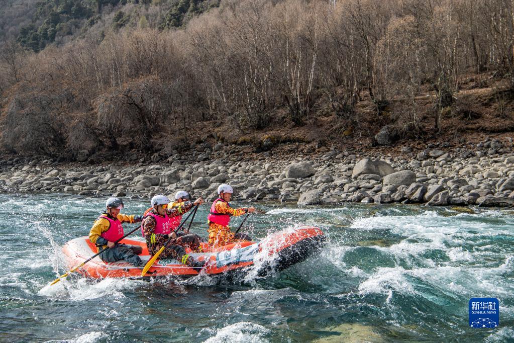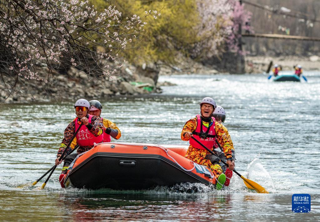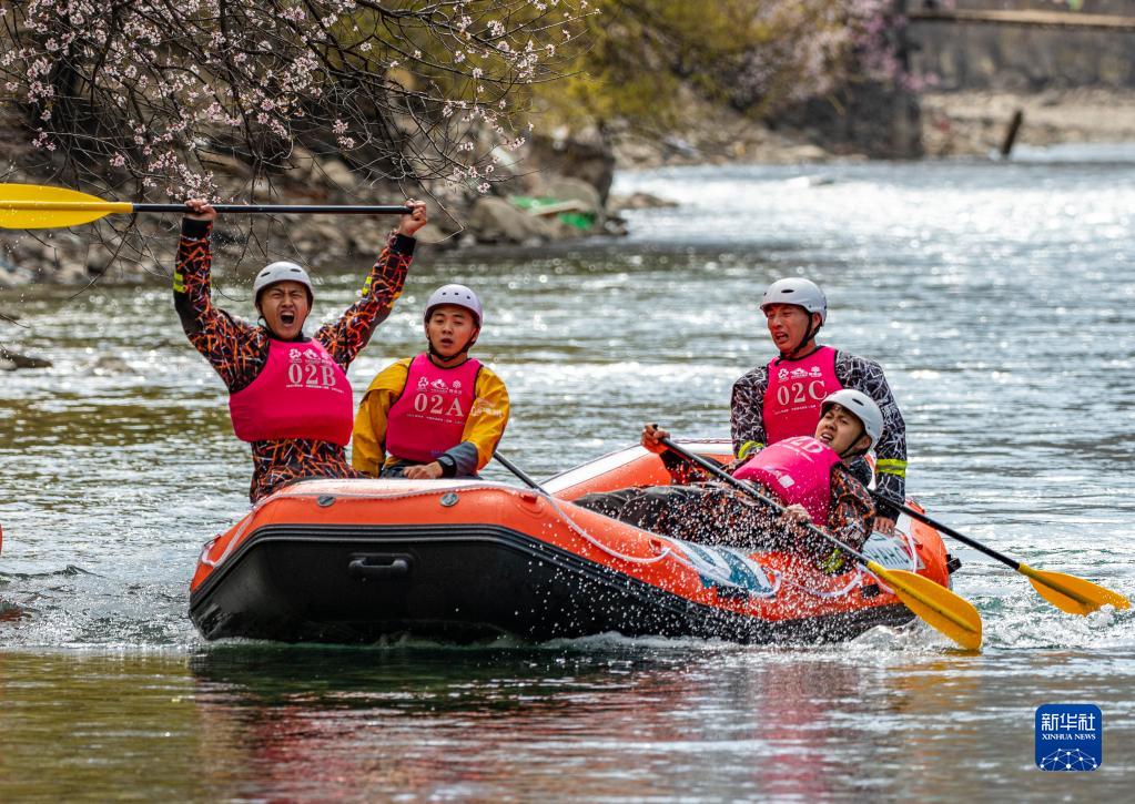 4月16日,西藏旅游股份有限公司漂流隊(前)在激流漂流筏追逐賽中。最終,他們獲得亞軍。新華社記者 孫非 攝