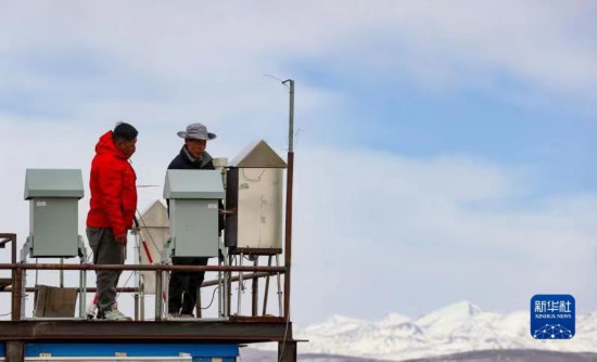 達瓦扎西(右)和同事扎西平措一起在檢查觀測儀器(4月13日攝)。新華社記者 姜帆 攝