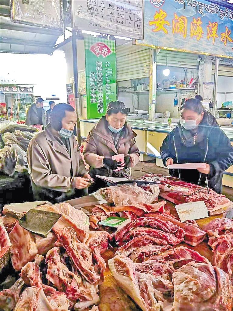 圖為拉薩市有關(guān)工作人員深入市場(chǎng),查看糧油菜肉蛋奶等商品價(jià)格、供應(yīng)情況。
