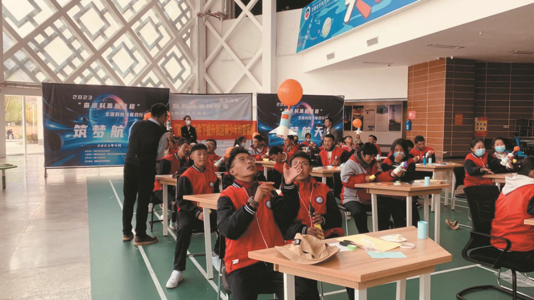 圖為在“筑夢(mèng)航天”科普活動(dòng)中,拉薩市第二職業(yè)技術(shù)學(xué)校學(xué)生們跟隨科技輔導(dǎo)員一起探索火箭升空的奧秘。 拉薩融媒記者 小索朗曲珍攝