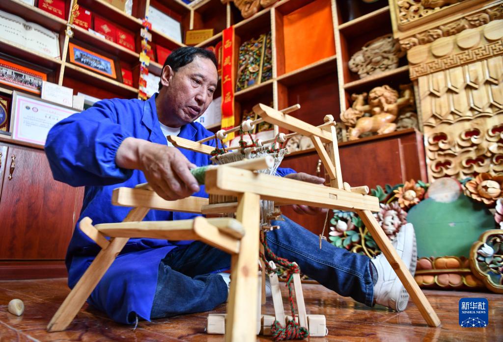 拉巴次仁在拼裝紡織機(jī)木雕工藝品(4月25日攝)。新華社記者 晉美多吉 攝