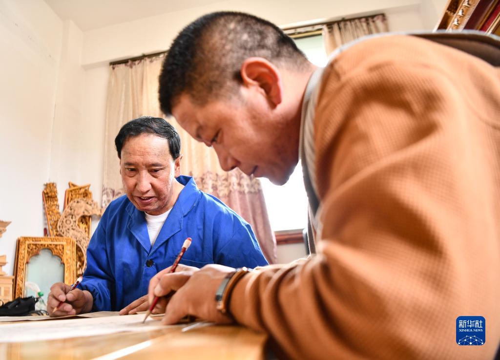 拉巴次仁(左)指導(dǎo)徒弟繪制木雕模板草圖(4月25日攝)。新華社記者 晉美多吉 攝