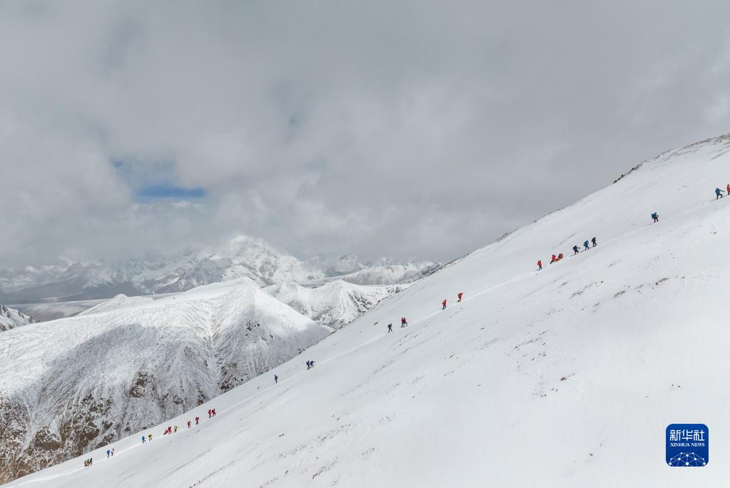 5月3日,登山愛好者正在向海拔6010米的洛堆峰峰頂進發(fā)。新華社記者 黃耀漫 攝