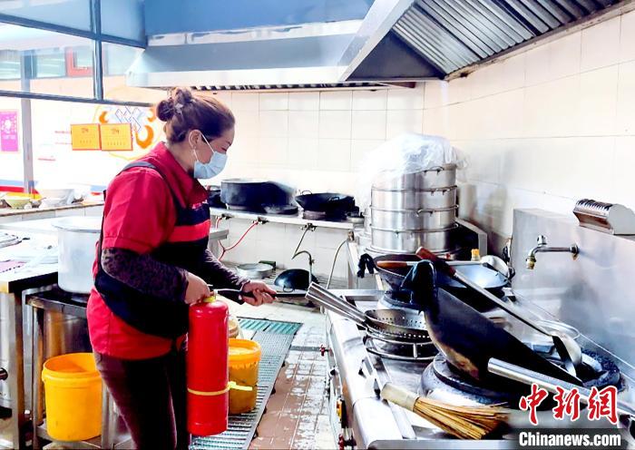 模擬廚房發(fā)生火災(zāi),員工發(fā)現(xiàn)火源后,立即關(guān)閉燃氣閥,拉閘斷電,第一時間利用周邊滅火器進行初期火災(zāi)撲救?!㈣?攝