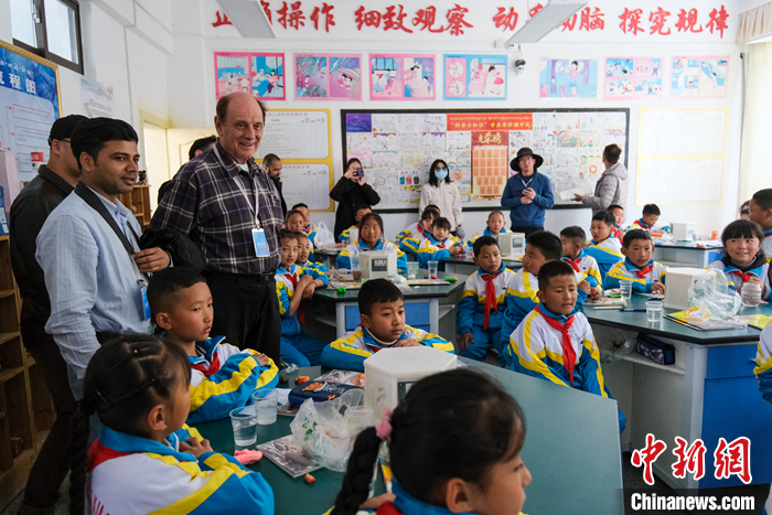圖為5月18日上午,參訪團(tuán)成員在林芝市第二小學(xué)觀看孩子們上實(shí)驗(yàn)課。中新社記者 江飛波 攝