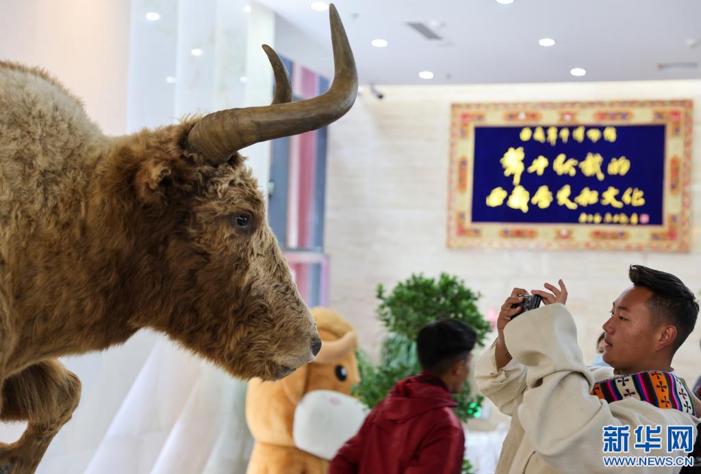 一名學生在西藏牦牛博物館拍攝展出的金絲野牦牛標本(5月18日攝)。新華社記者 姜帆 攝