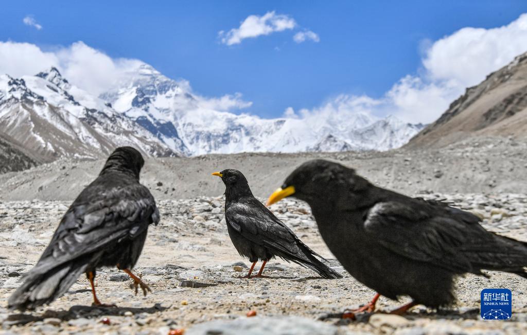 黃嘴山鴉在珠峰腳下覓食(5月14日攝)。新華社記者 晉美多吉 攝
