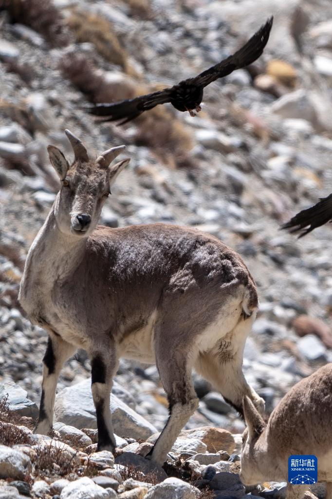 這是在珠峰國家級自然保護區(qū)內(nèi)拍攝的巖羊和黃嘴山鴉(5月13日攝)。新華社發(fā)(旦增努布 攝)