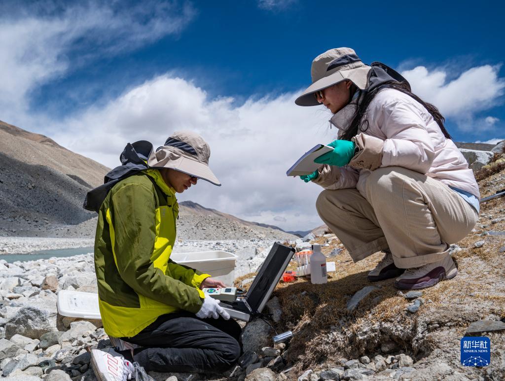 在珠峰登山大本營(yíng),中國(guó)科學(xué)院西雙版納熱帶植物園研究員蘇濤(右)和同事在樣品自封袋上做標(biāo)記(5月14日攝)。新華社記者 孫非 攝