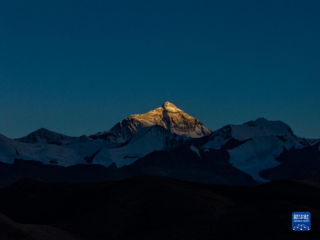 這是5月16日日落時(shí)分拍攝的珠穆朗瑪峰(無人機(jī)照片)。新華社記者 晉美多吉 攝
