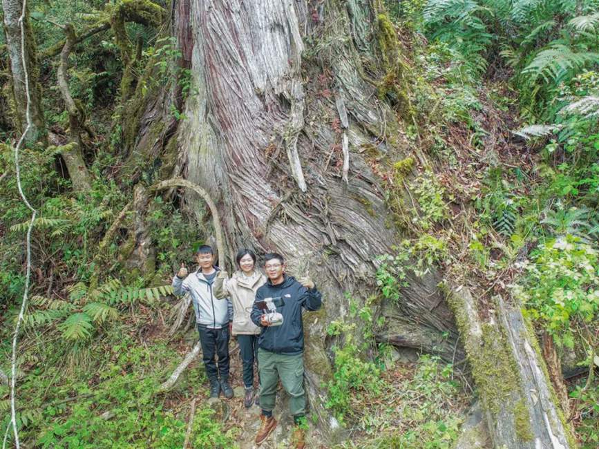 圖為測量人員站在西藏柏木最高樹下合照。