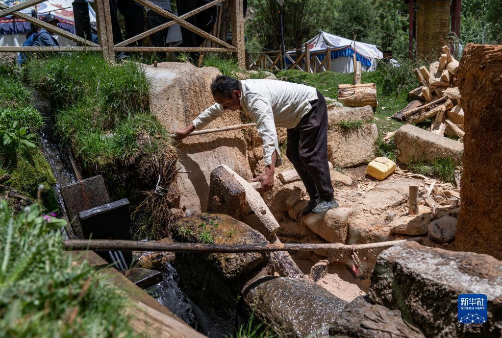 在西藏尼木縣吞巴鎮(zhèn)吞達村,次仁多吉在啟動水磨,將作為原料的柏木碾成木漿(6月9日攝)。新華社記者 孫非 攝