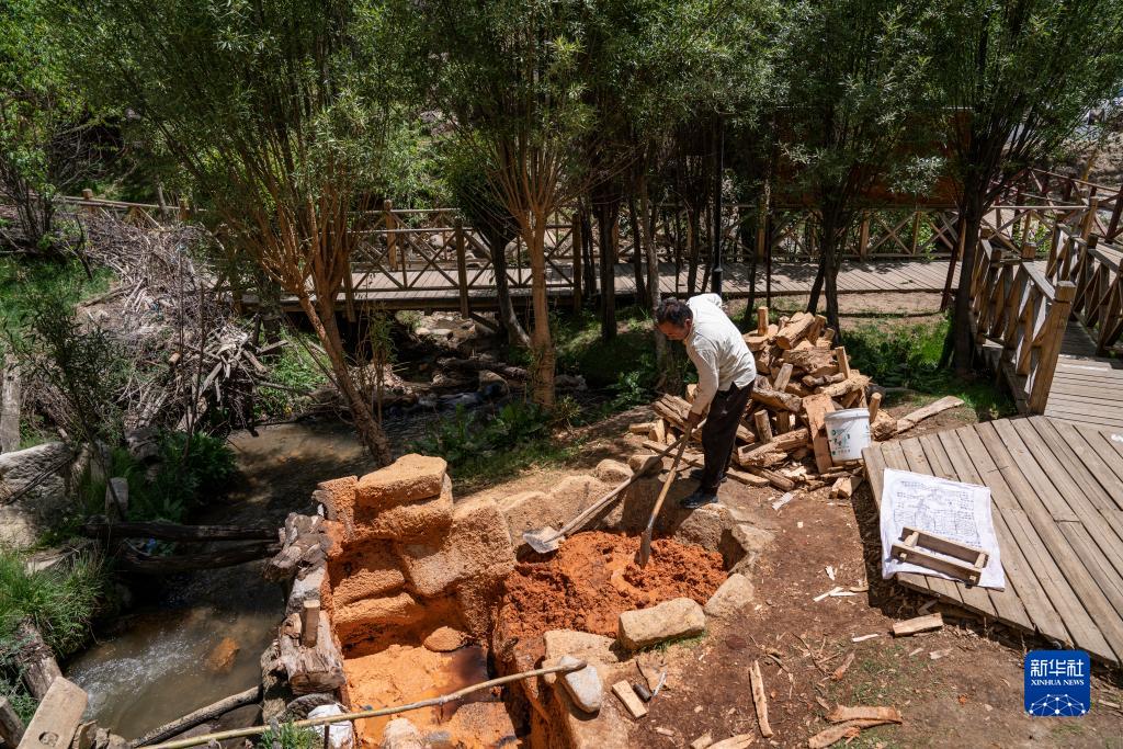 在西藏尼木縣吞巴鎮(zhèn)吞達村,次仁多吉用水浸潤晾曬后的香磚(6月9日攝)。新華社記者 孫非 攝