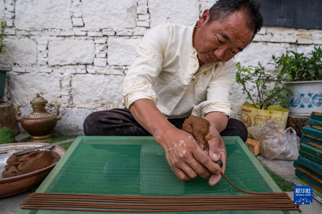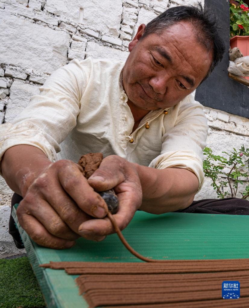 要保證每一根成型的藏香均勻且筆直,很考驗匠人的功底。為了制作合格的藏香,次仁多吉在地上一坐就是一整天,擠出的線香鋪滿房間。多年的制香經(jīng)歷,讓他在擁有出眾技藝的同時,也患上了職業(yè)病——時常關節(jié)疼。但次仁多吉不僅堅持至今,還順應市場,研發(fā)了提神香、安眠香等新品種,并擴大了生產(chǎn)規(guī)模。