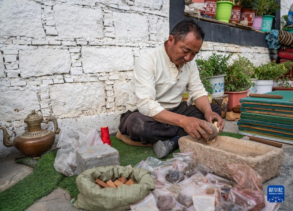 在西藏尼木縣吞巴鎮(zhèn)吞達村,次仁多吉在研磨藥材和香料(6月9日攝)。新華社記者 孫非 攝