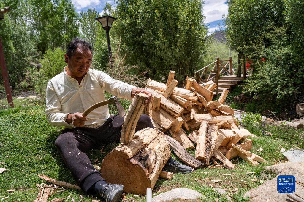 在西藏尼木縣吞巴鎮(zhèn)吞達村,次仁多吉在砍削柏木,為藏香制作準備原料(6月9日攝)。新華社記者 孫非 攝