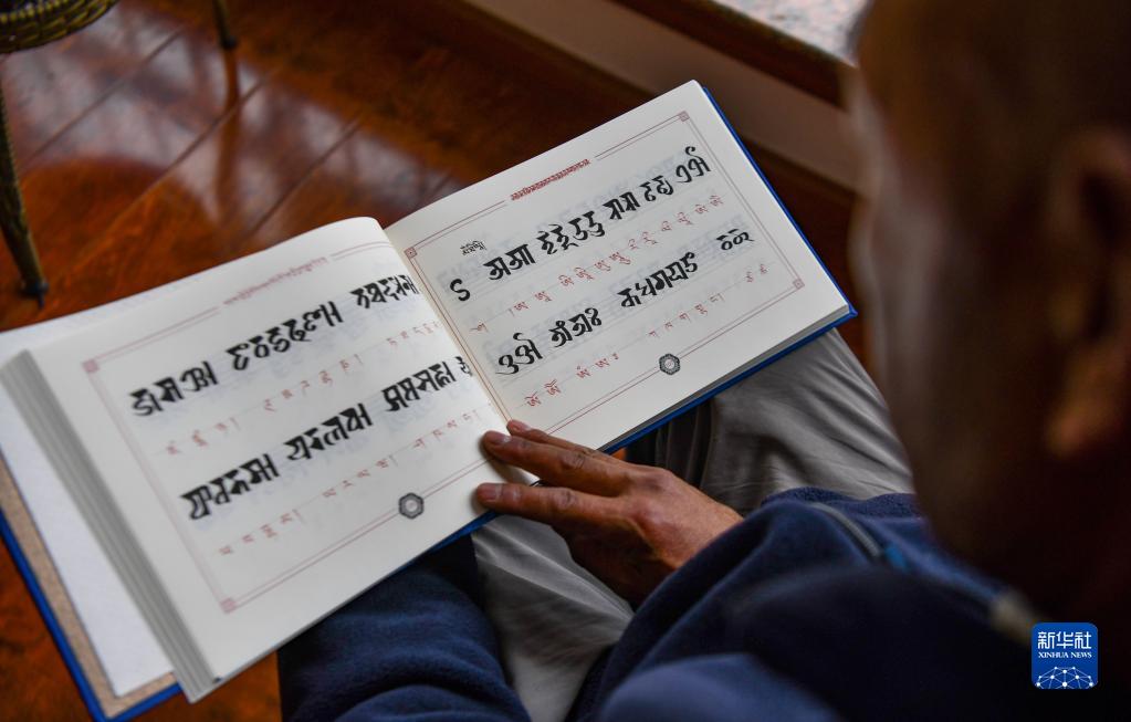 羅布林卡管理處古籍普查團隊成員查閱梵文藏文對照工具(4月19日攝)。新華社記者 晉美多吉 攝