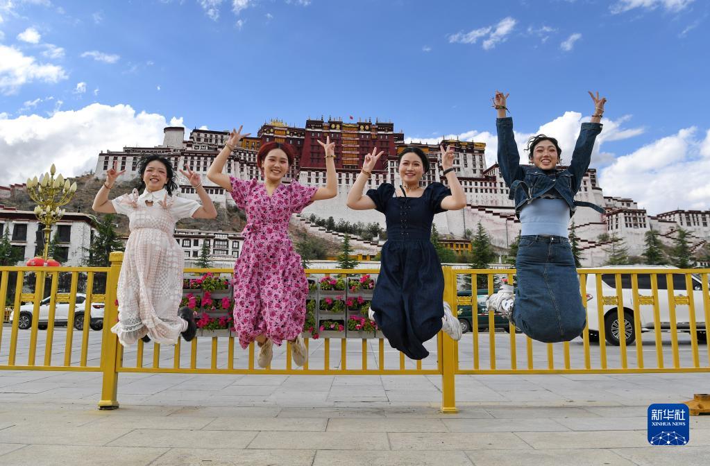 游客在布達(dá)拉宮廣場(chǎng)上合影留念(6月16日攝)。新華社記者 張汝鋒 攝