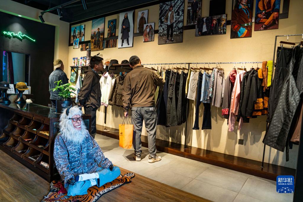 在拉薩一家以“雪怪”為主題的藏式時(shí)裝店,顧客們選購商品(6月18日攝)。新華社記者 孫非 攝