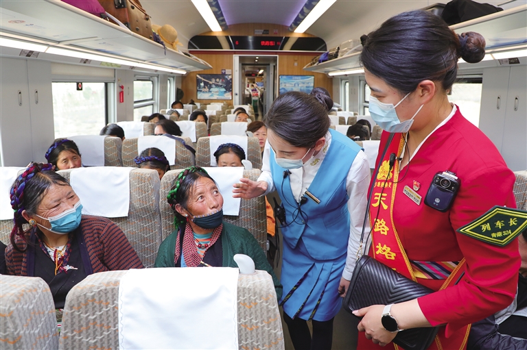 2022年初,青藏集團(tuán)有限公司在管內(nèi)各站、車開(kāi)展“天路格?;ā逼放苿?chuàng)建以來(lái),拉林鐵路各車站、各次列車上都能看到“天路格?;ā狈?wù)隊(duì)員,他們用真誠(chéng)、熱情、熱心為每一位旅客提供溫馨細(xì)致的服務(wù)。“6月初,我?guī)е⒆觼?lái)西藏旅游,6月20日前往林芝,游玩了三天,由于家里有事,不得不趕回去,就買了今天中午回拉薩的火車票,剛開(kāi)車不久我姑娘就發(fā)燒,肚子痛。列車員看見(jiàn)孩子難受就詢問(wèn)情況,并找來(lái)列車長(zhǎng)周晶,通過(guò)廣播為我們找醫(yī)生,還好沒(méi)啥大事,就是腸胃感冒,我也就放心了。周晶車長(zhǎng)也一直在旁邊幫我照顧孩子,拿濕毛巾擦臉,蓋毛毯,送來(lái)熱水,太細(xì)心了,讓我很感動(dòng)。她們工作認(rèn)真負(fù)責(zé),服務(wù)周到,我一路上都親身感受到了高原動(dòng)車的熱情。”在24日林芝到拉薩的C926次列車上,來(lái)自四川的高雅女士拉著記者激動(dòng)地說(shuō)。