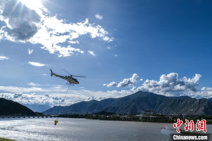 8月8日,空客H125直升機(jī)在拉薩進(jìn)行吊桶灑水飛行演示。中新社記者 江飛波 攝