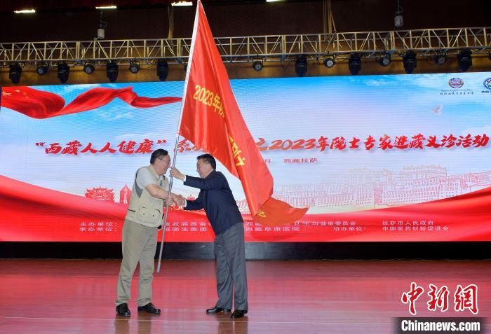 8月9日,“西藏人人健康”2023年院士、專家進(jìn)藏義診活動啟動儀式上,西藏自治區(qū)副主席甲熱·洛桑丹增(圖右)為義診專家團(tuán)隊(duì)代表授旗。李林 攝